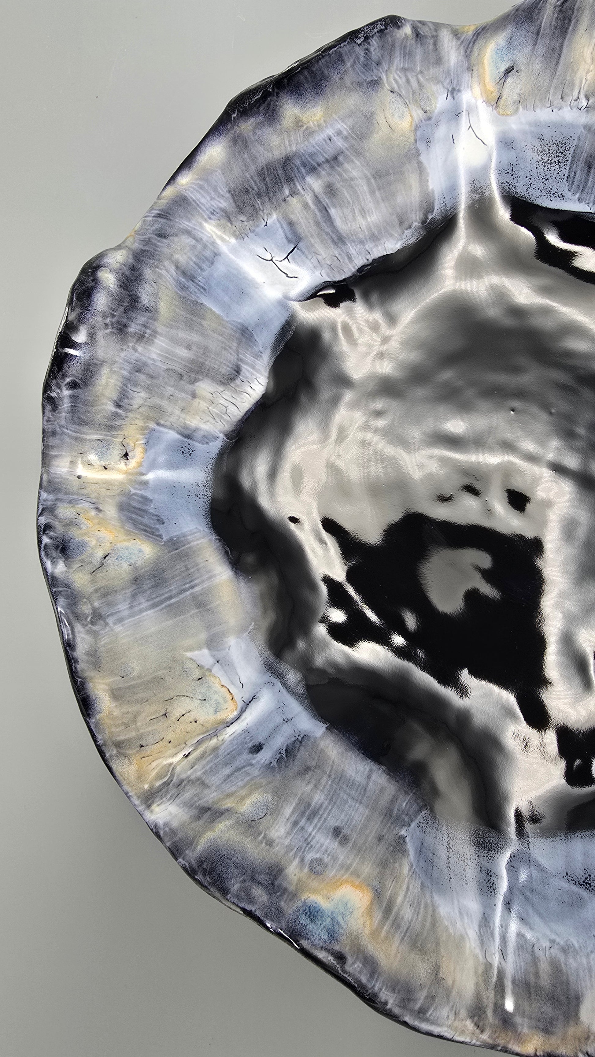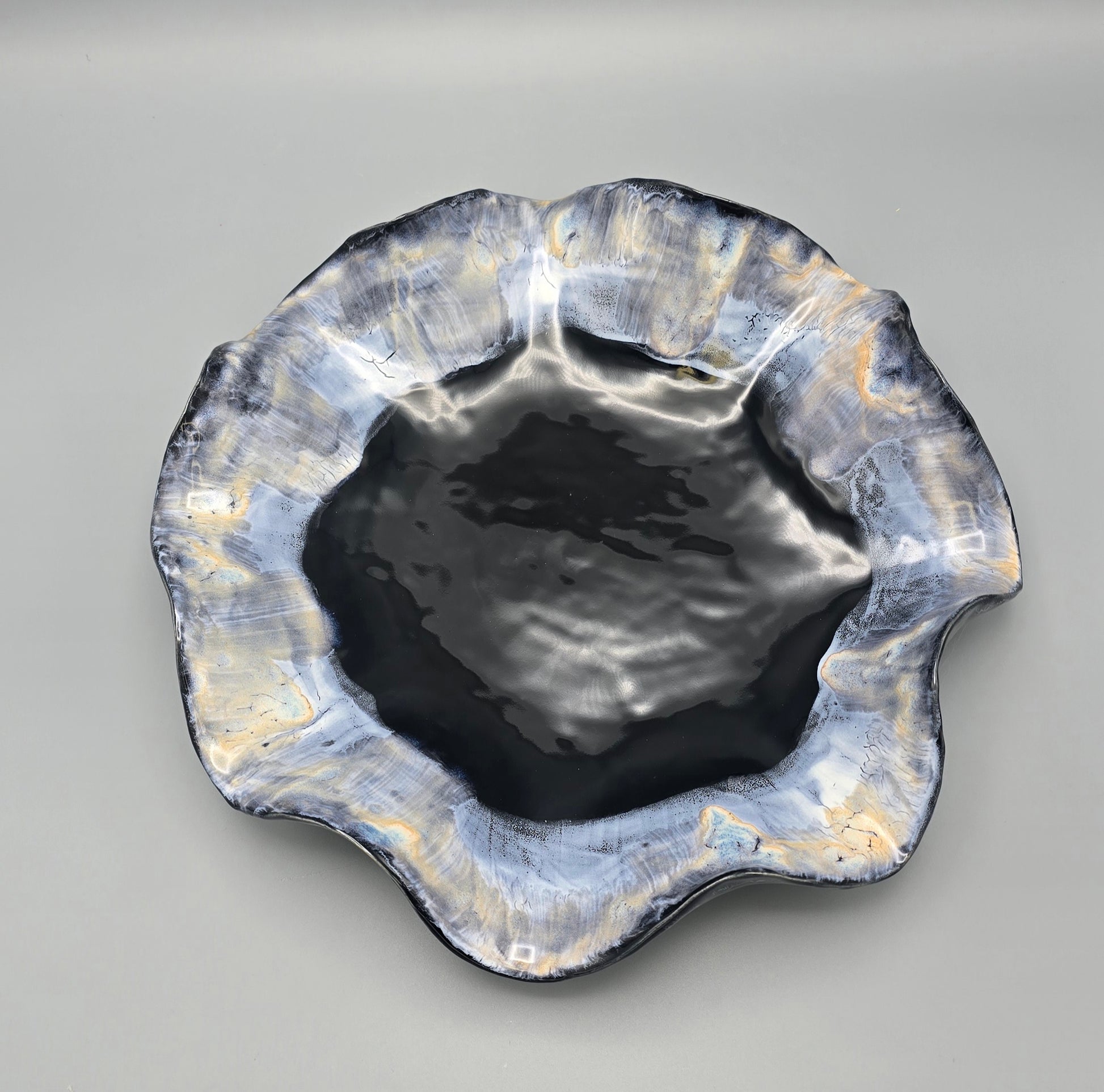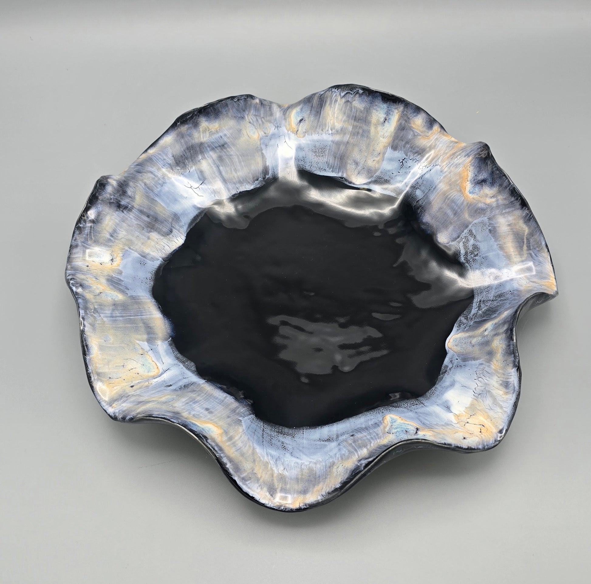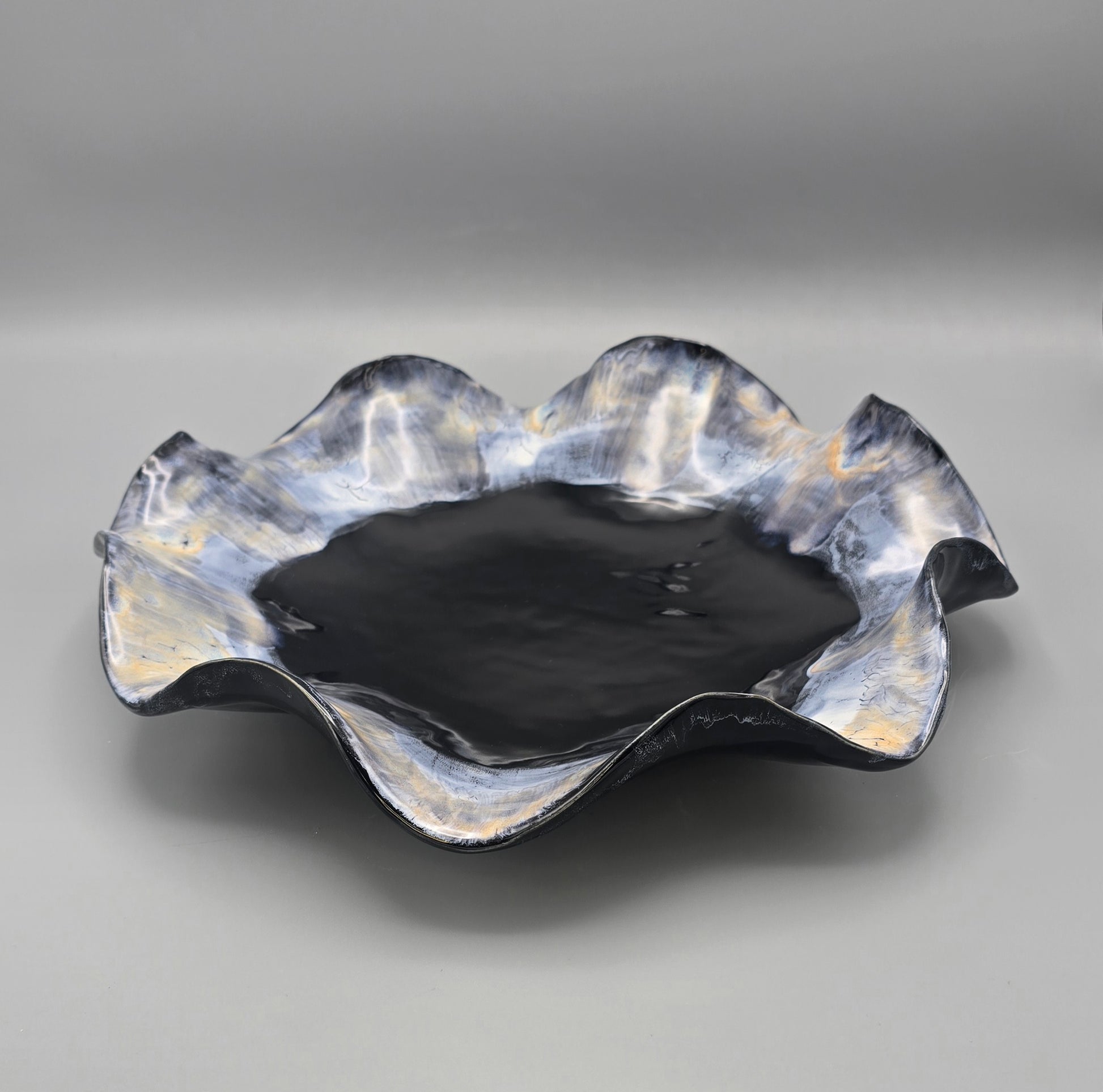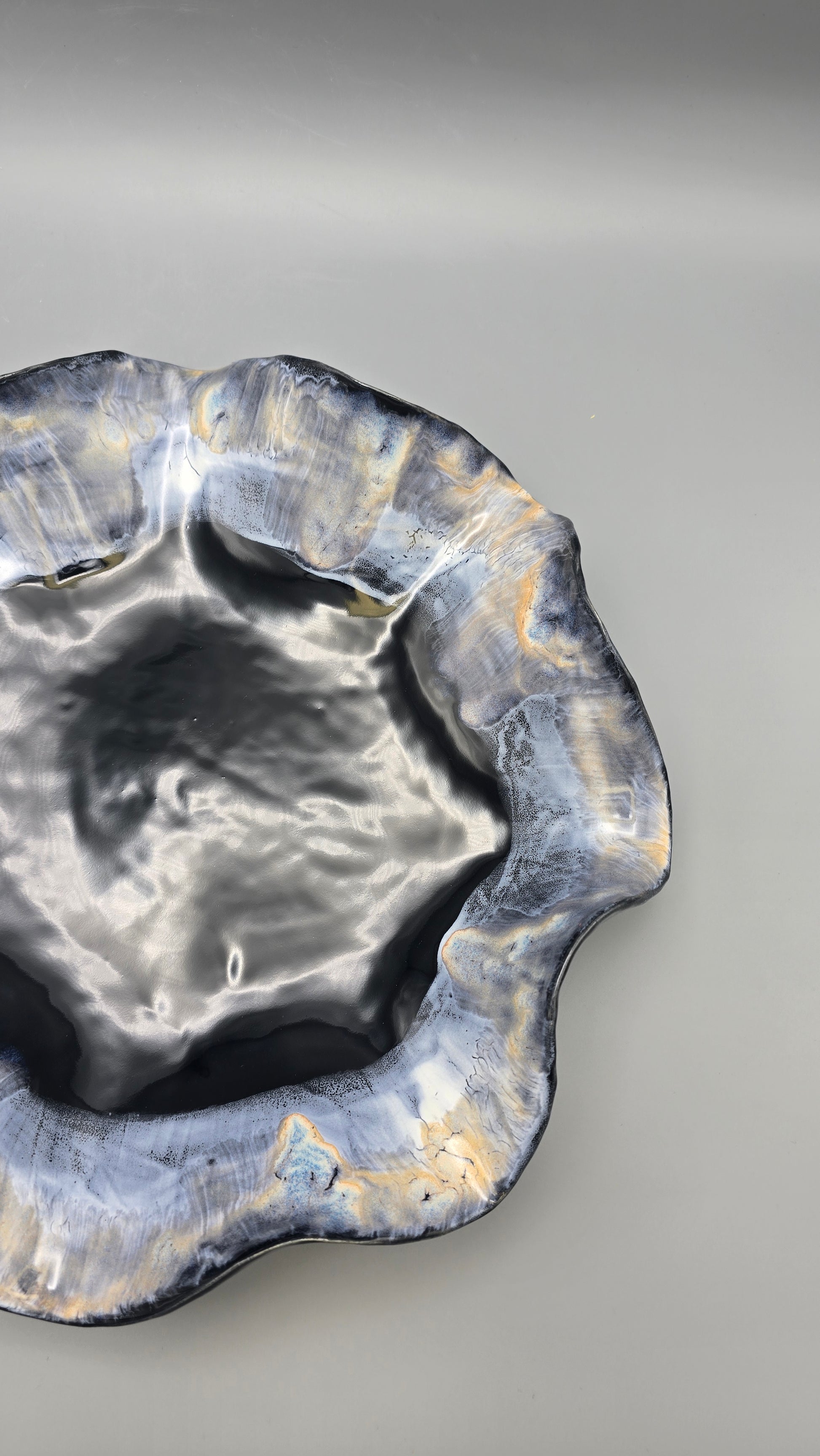 Aurora Ciel de Minuit captures the calm poetry of midnight skies. Deep tones of black and indigo blend with soft gold reflections, evoking the serene glow of starlight over water. Each curve tells a story of movement and stillness, sculpted by hand and finished in layered glazes that shift gently with the light.