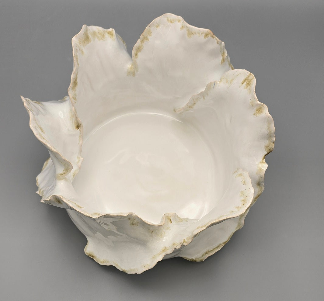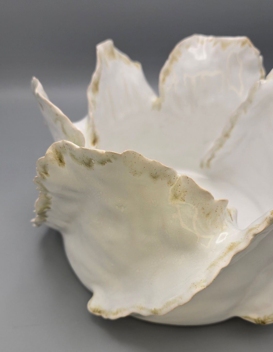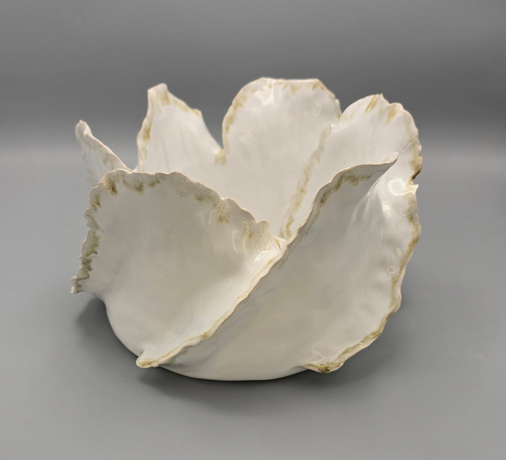 Inspired by the fluid grace of ocean waves, this piece captures movement in serene stillness. Each handbuilt curve flows naturally, forming a sculptural silhouette with soft, organic edges. Finished in luminous white and delicately traced with a brown-gold rim, it echoes the timeless rhythm and quiet beauty of the sea.