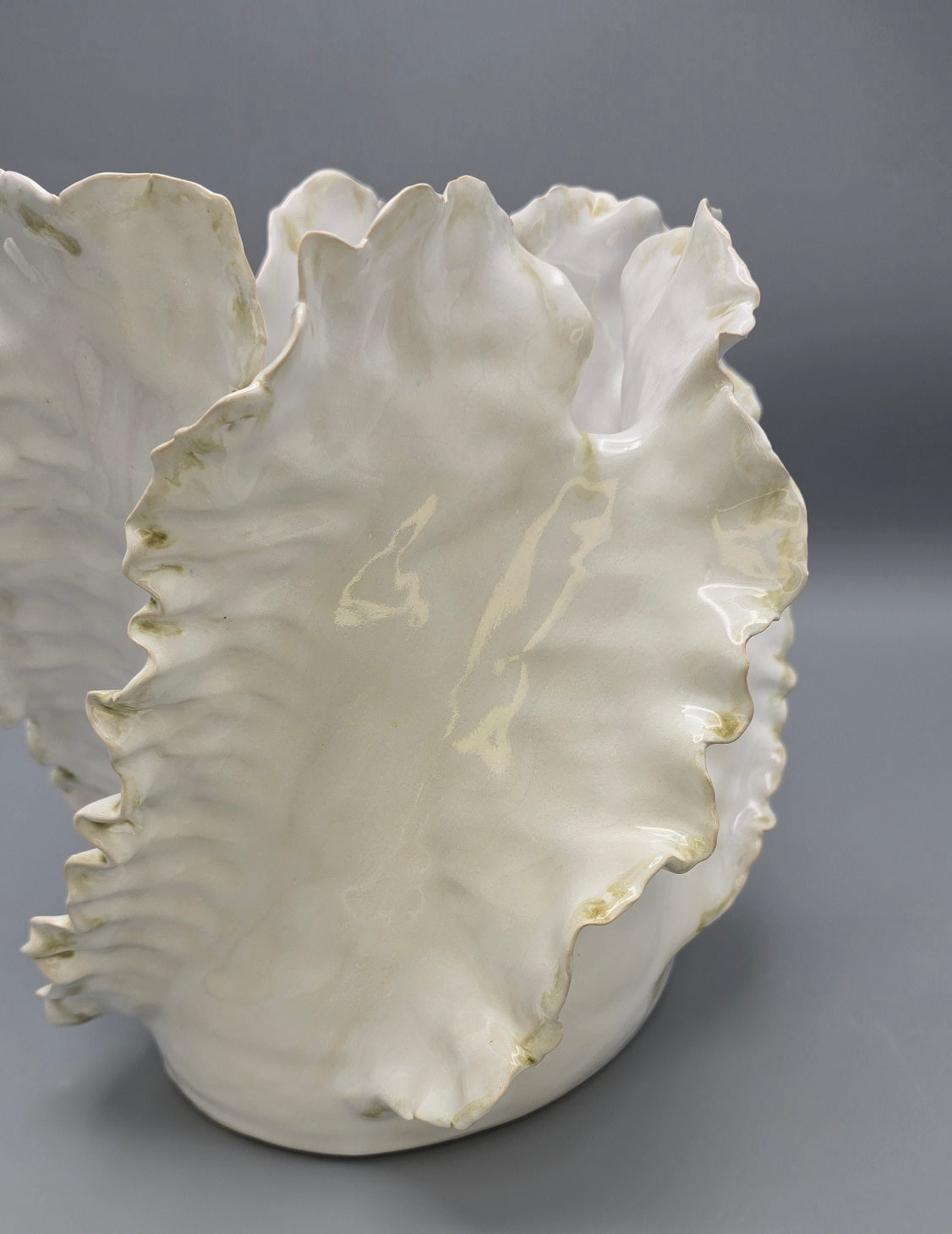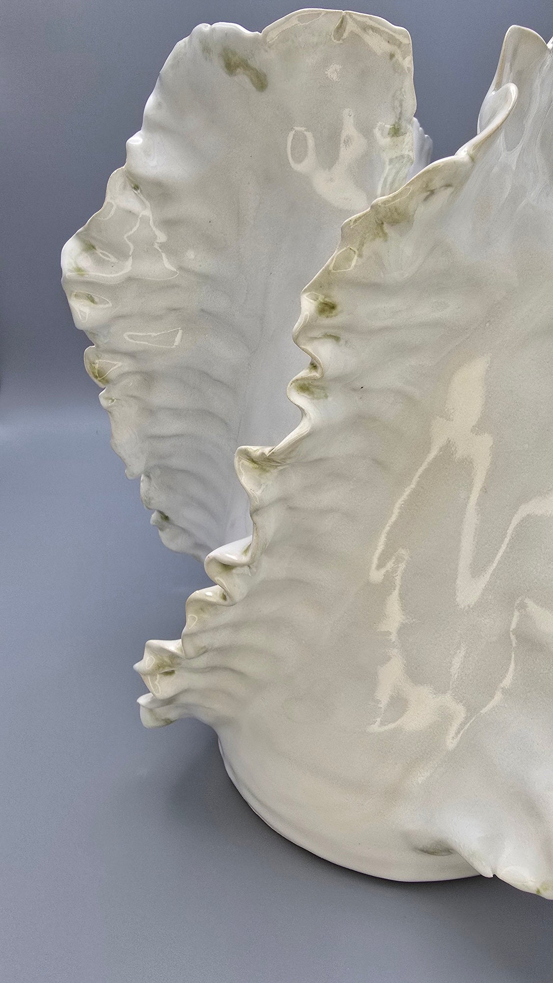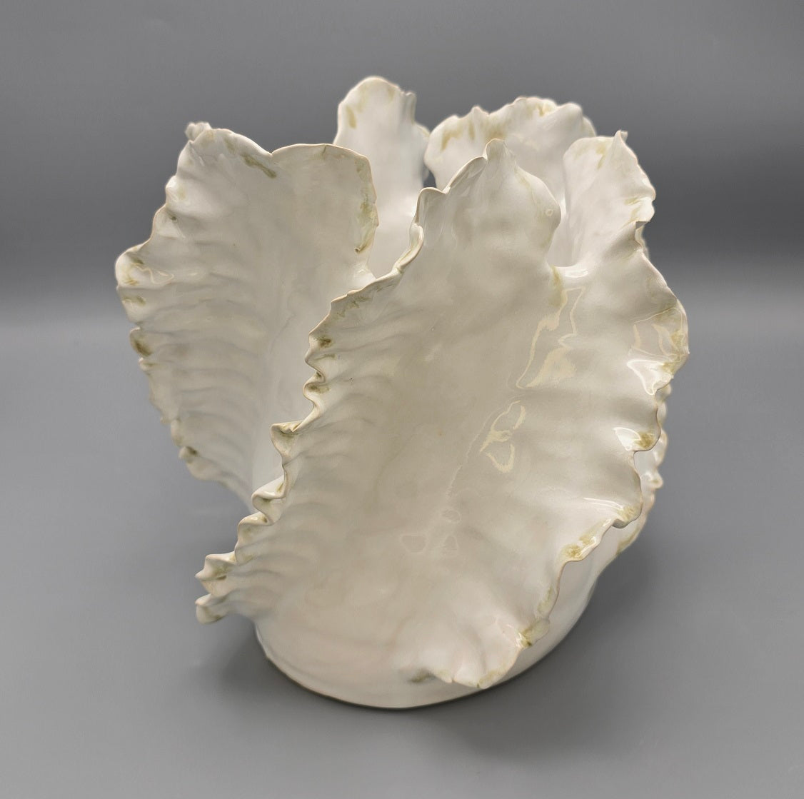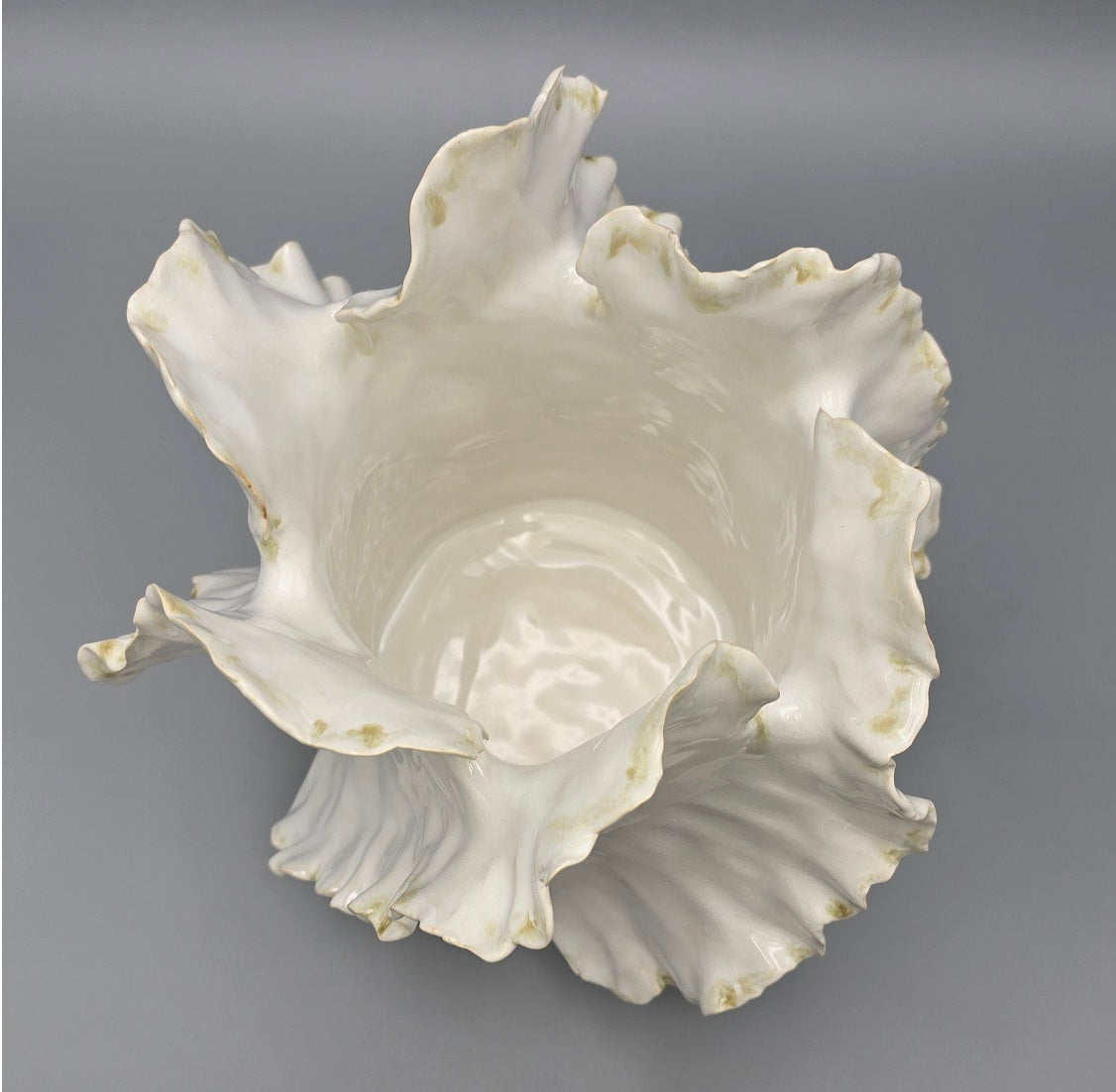 Inspired by the fluid grace of ocean waves, this piece captures movement in serene stillness. Each handbuilt curve flows naturally, forming a sculptural silhouette with soft, organic edges. Finished in luminous white and delicately traced with a brown-gold rim, it echoes the timeless rhythm and quiet beauty of the sea.