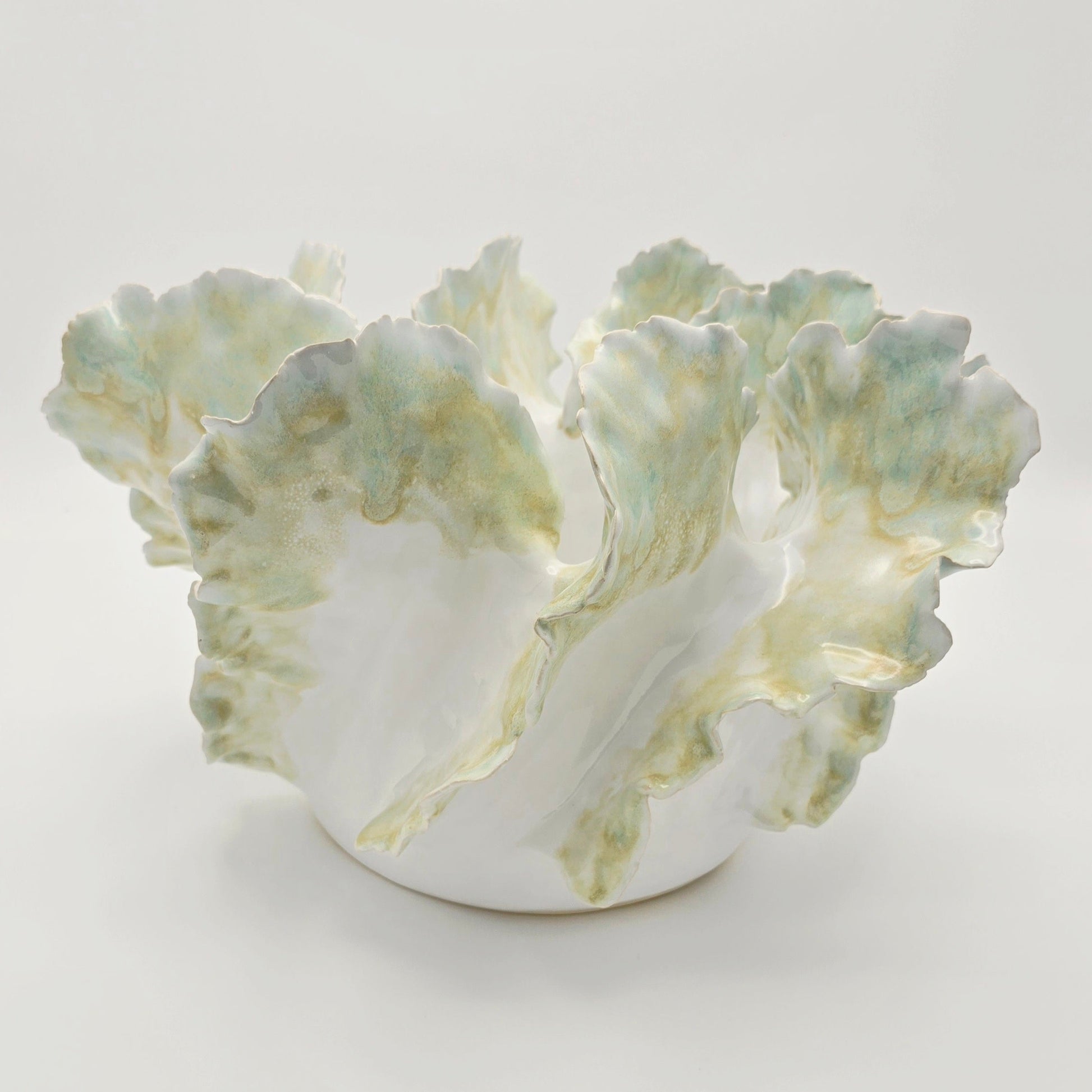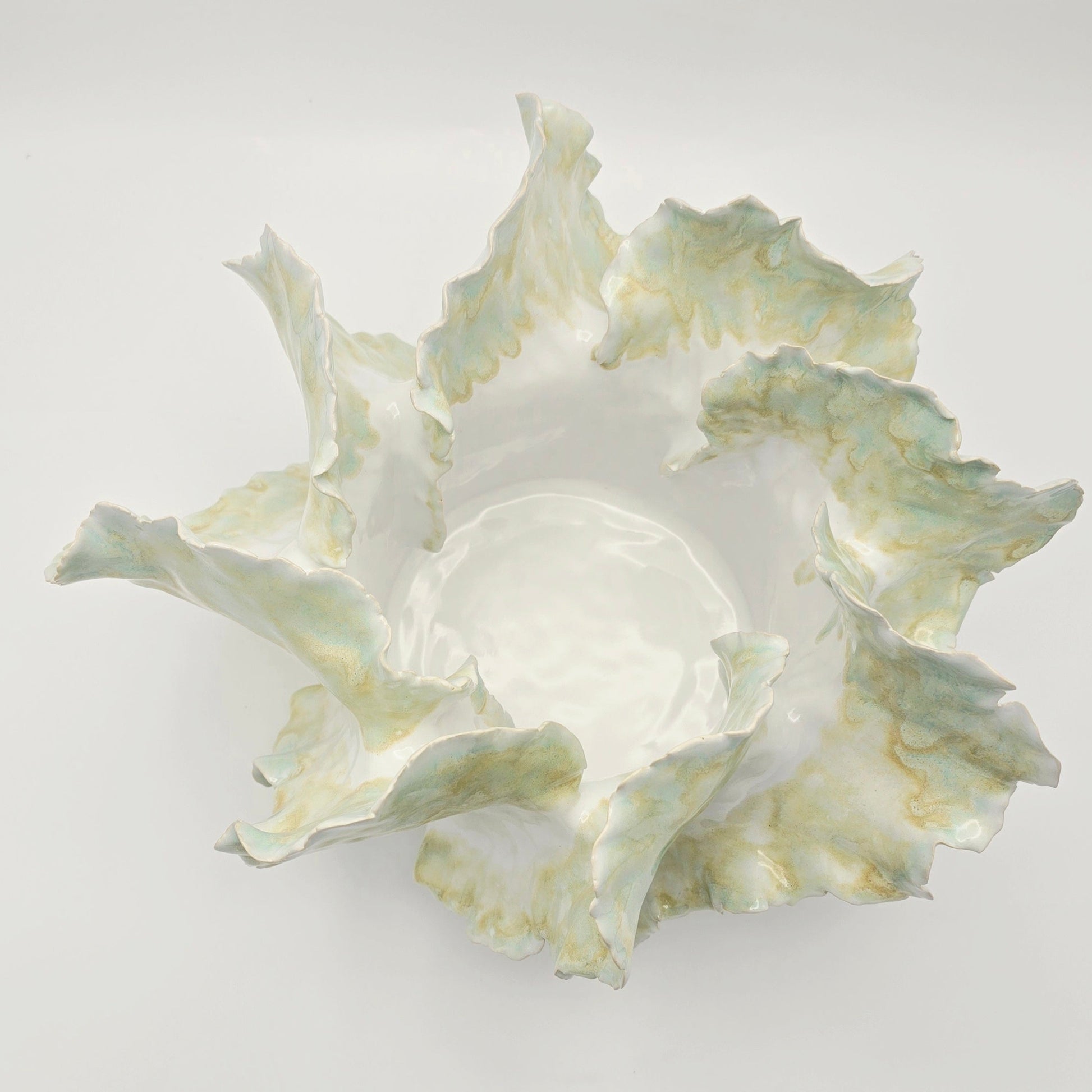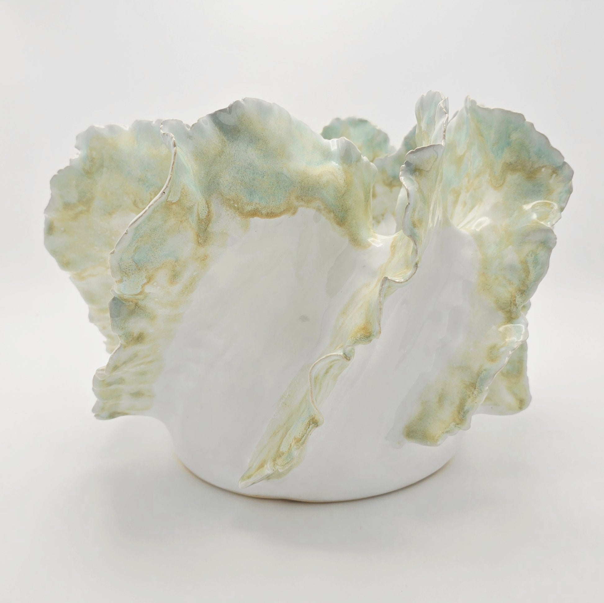 The Wave Mistral Royale: Inspired by the fluid grace of ocean waves, this piece captures movement in serene stillness. Each handbuilt curve flows naturally, forming a sculptural silhouette with soft, organic edges. Where the softness of a sea-born breeze, with white and misty aqua, blend gently across the curves.