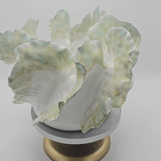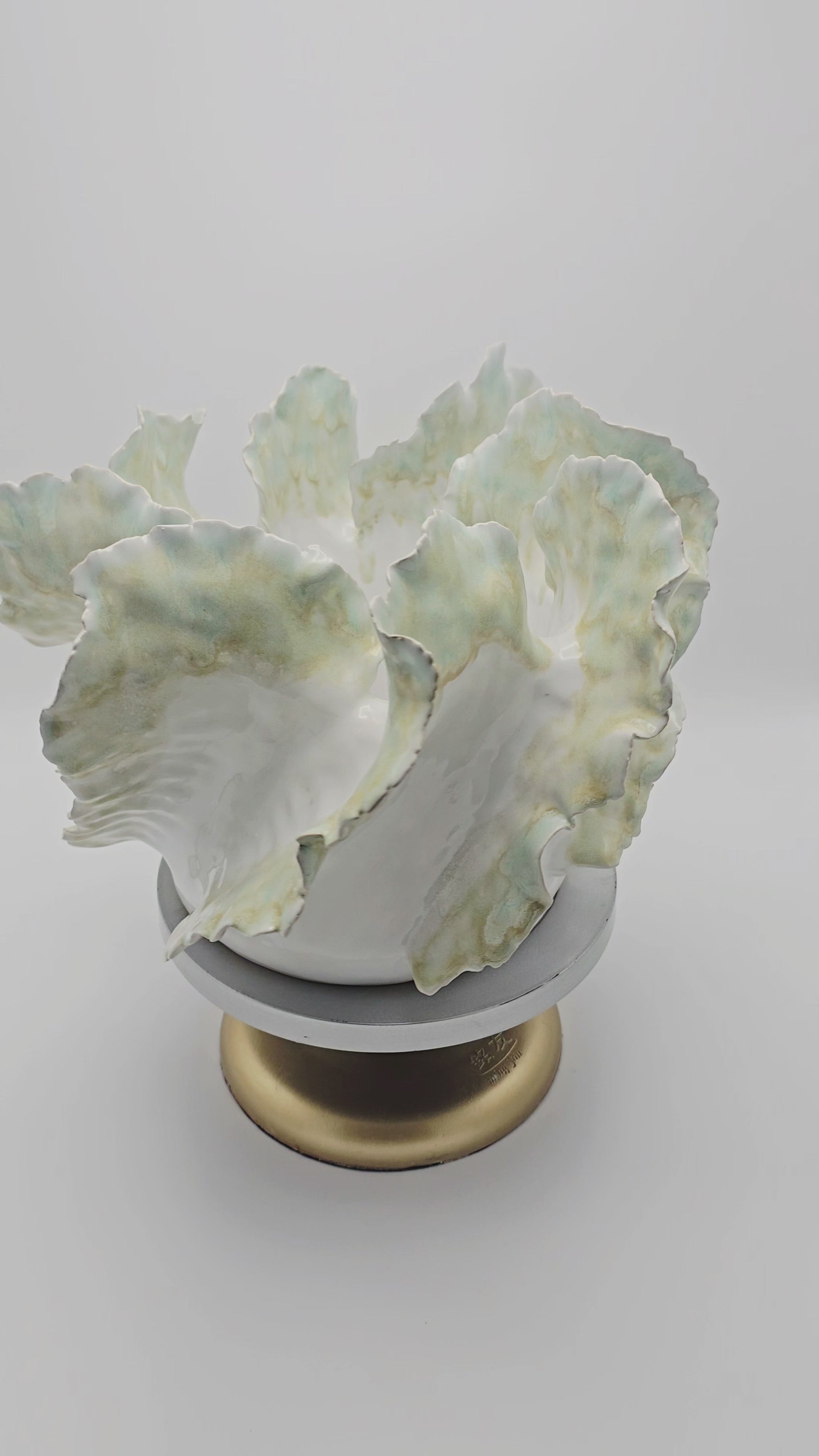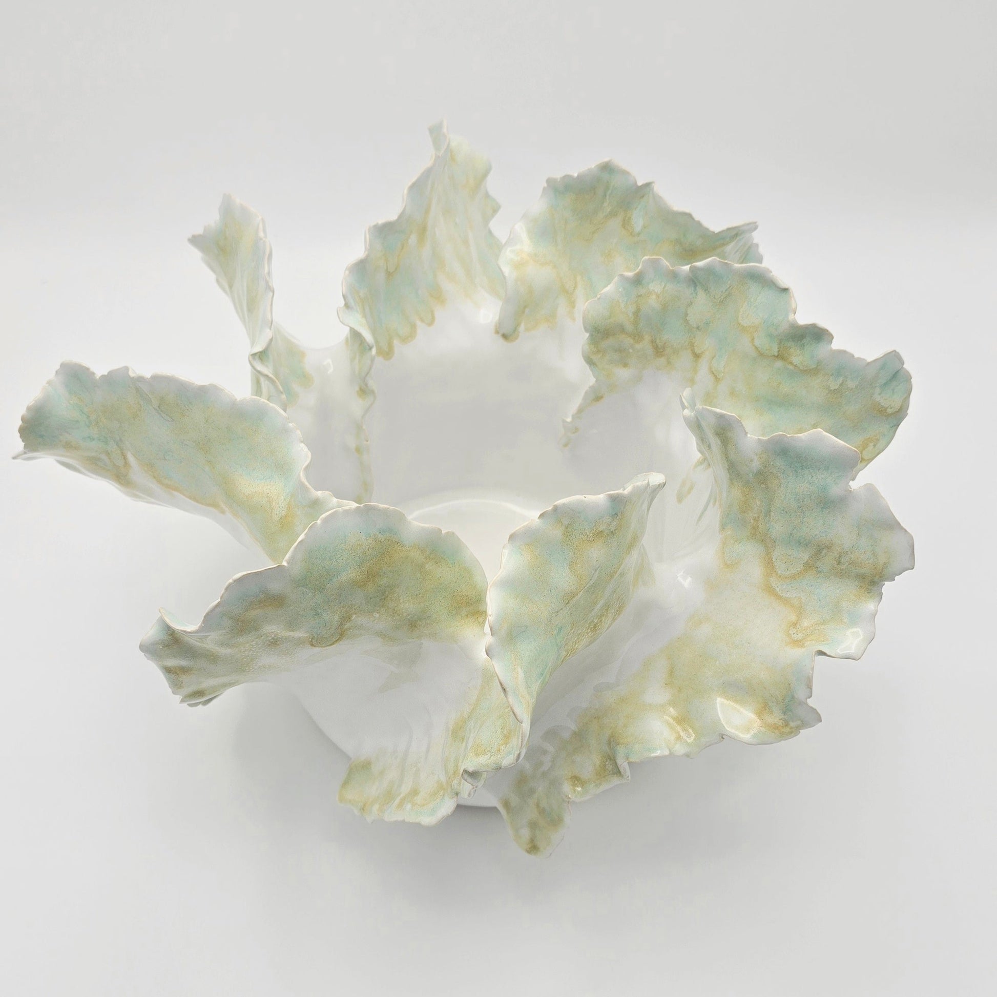 The Wave Mistral Royale: Inspired by the fluid grace of ocean waves, this piece captures movement in serene stillness. Each handbuilt curve flows naturally, forming a sculptural silhouette with soft, organic edges. Where the softness of a sea-born breeze, with white and misty aqua, blend gently across the curves.